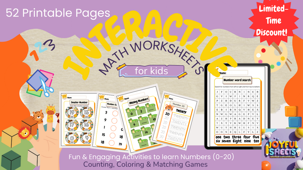 Interactive Math Worksheets for Kids: A Fun Journey to Learn Numbers & Counting! Boost your child's math skills with 50+ pages of engaging educational activities. Learn numbers (0-20), counting, sequencing, writing, and more! Perfect for preschool and first-grade math education. Print-ready worksheets, interactive activities, educational games, math exercises, and more! Don't miss the 100% discount for the first 50 buyers with code: JOYFUL10.